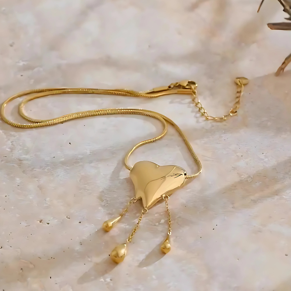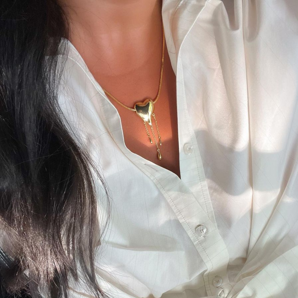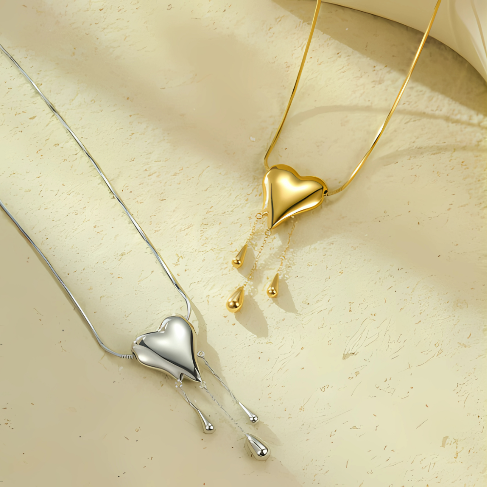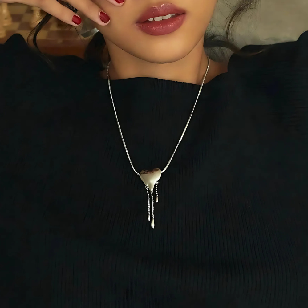 Make a bold statement with the Melting Heart Necklace, a stunning piece blending luxury and edge. Its heart-shaped design is beautifully enhanced with flowing golden accents, symbolizing fierce passion and elegance.