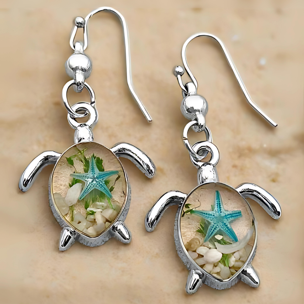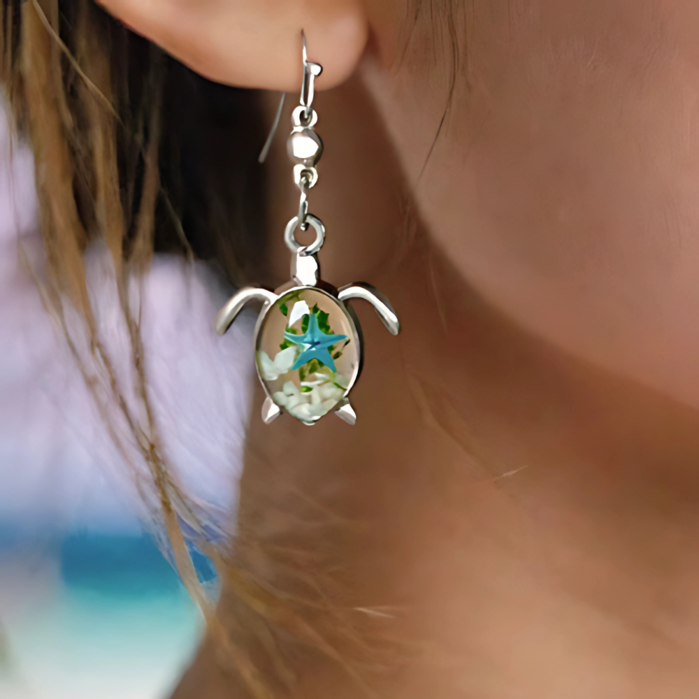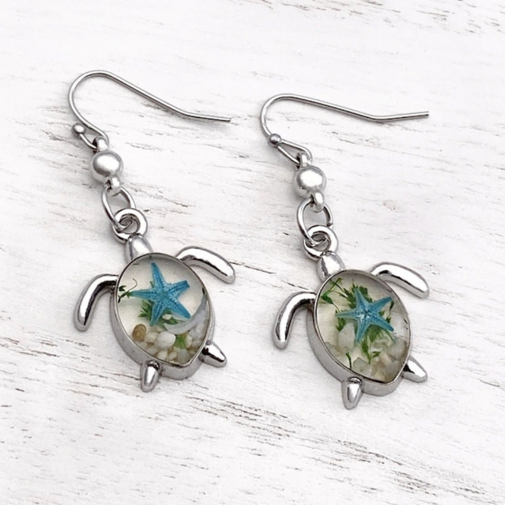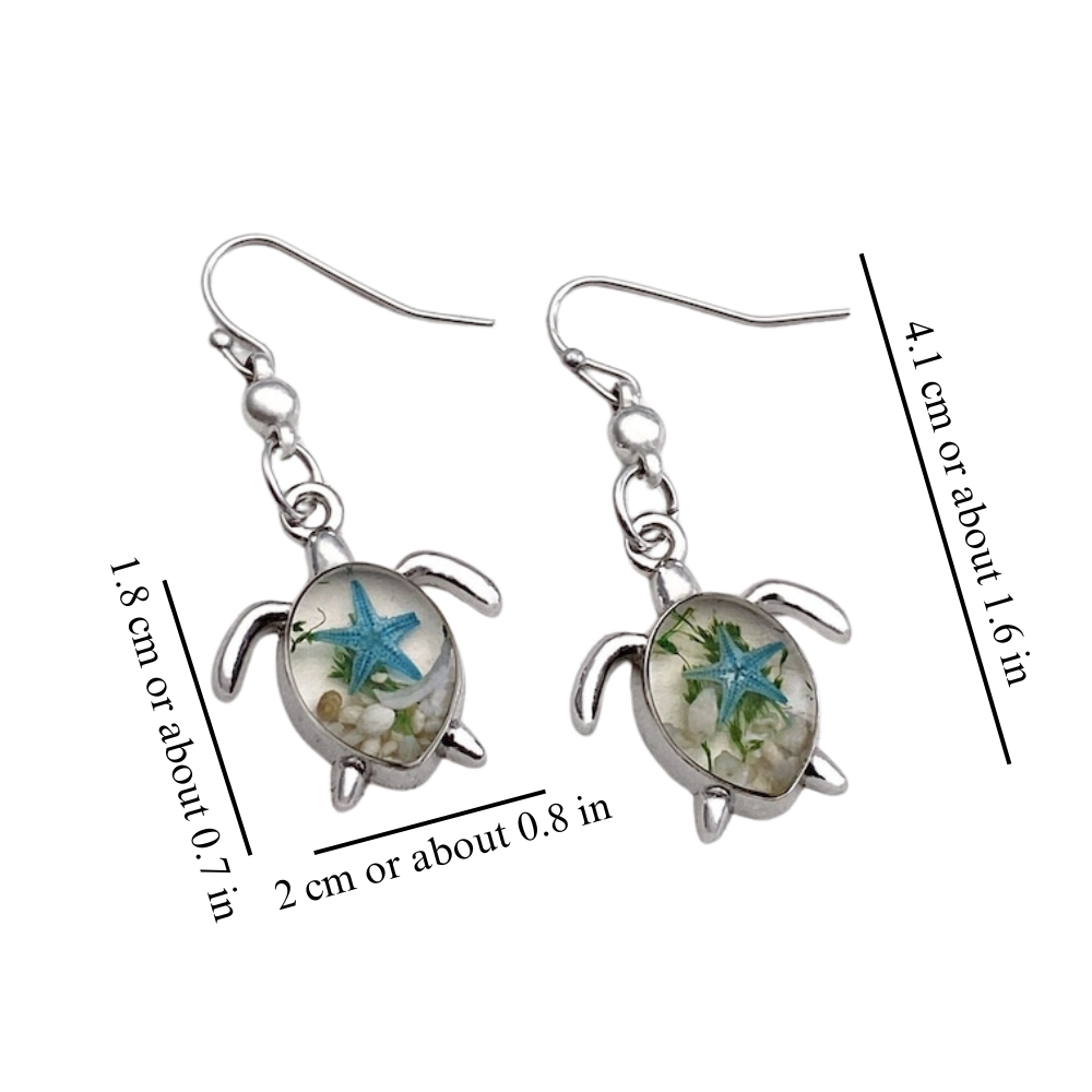 A: The Sea Turtle Earrings are made from high quality silver plated alloy and stainless steel hooks, natural stones and natural dried starfishes.